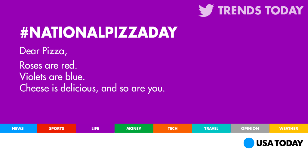 “@USATODAY: Forget #ValentinesDay. #NationalPizzaDay is the day to celebrate your real love. pic.twitter.com/yT2ETejJbY”