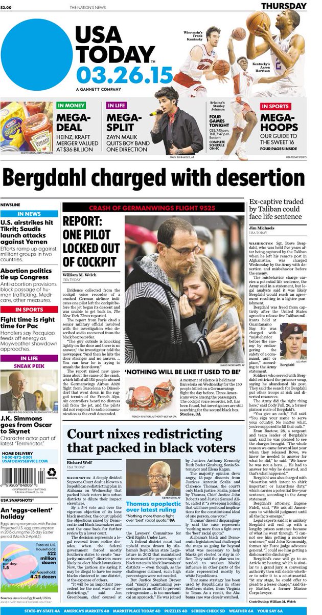 Today's #frontpage: Bergdahl charged with desertion. Pilot locked out of cockpit before #Germanwings crash.pic.twitter.com/GLNhelJcpz