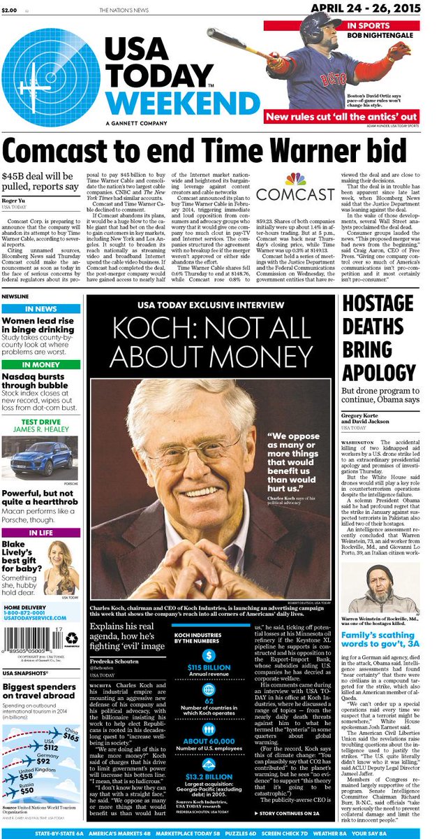 Today's #frontpage: Despite hostage deaths, #drone program to continue. Charles Koch says it's not all about money.pic.twitter.com/vcuqxrZyKU
