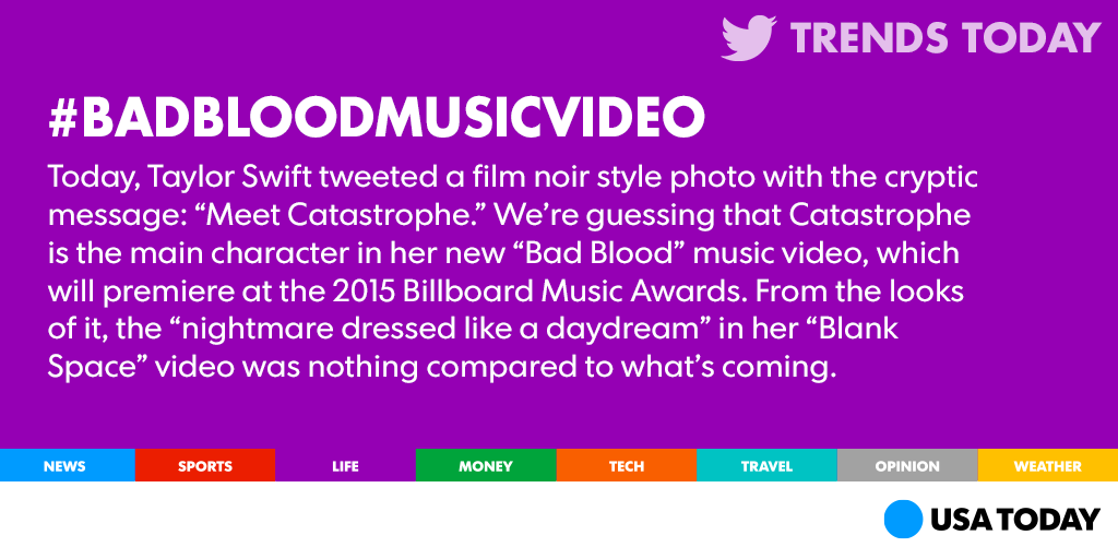 OK, you can start freaking out now: A new@taylorswift13 video is coming.http://usat.ly/1KPJCbm #BadBloodMusicVideopic.twitter.com/InK7EUPvWw