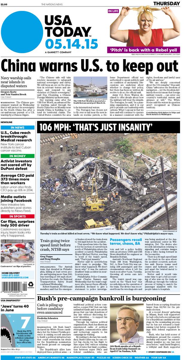 In Thursday's paper: #Amtrak train was going twice the speed limit. #China warns US to keep out of disputed waters.pic.twitter.com/MFV2eA5UDQ
