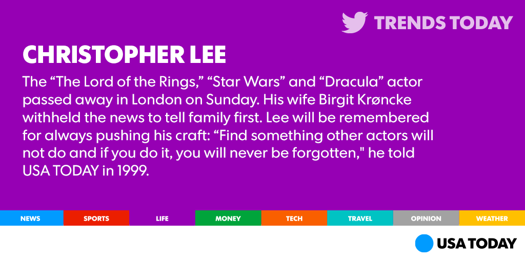 Iconic British actor Sir Christopher Lee has died at the age of 93. http://usat.ly/1IK3JKC pic.twitter.com/5QHkEGNi2Y