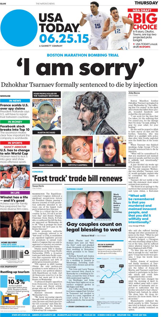 A look at Thursday's paper: #BostonBombing culprit sentenced to death. #Congress renews #FastTrack trade authoritypic.twitter.com/m0mo7YFO3v