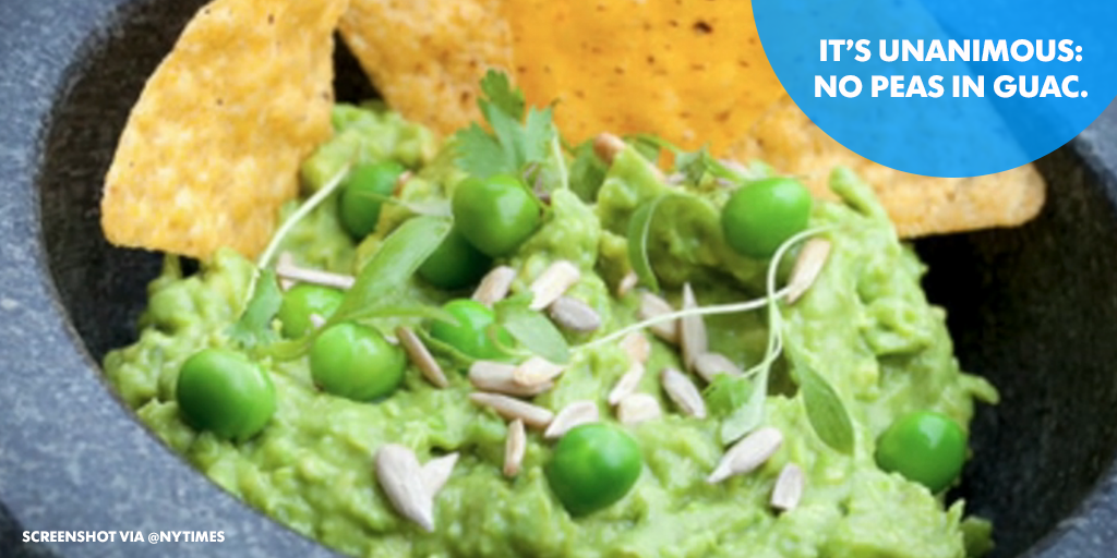 @USATODAY@wfaachannel8 Peas are a wonderful veggie..but..not..on guacamole!Thanks. Twitter will use this to make your timeline better. UndoUndo