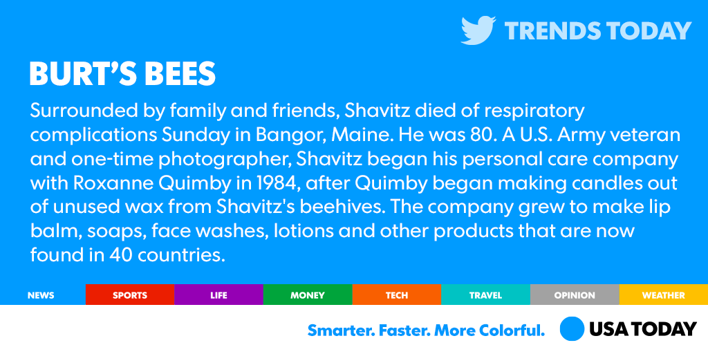 Burt Shavitz, the beekeeper who co-founded Burt's Bees natural cosmetics company, has died. http://usat.ly/1LO9d77 pic.twitter.com/5SIWs8joHc