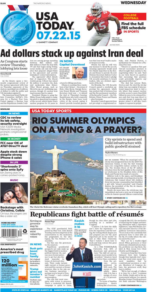 On today's #frontpage: Ad dollars stack up against #IranNukeDeal. #Rio faces hurdles for #SummerOlympicspic.twitter.com/wRXXccAMkB