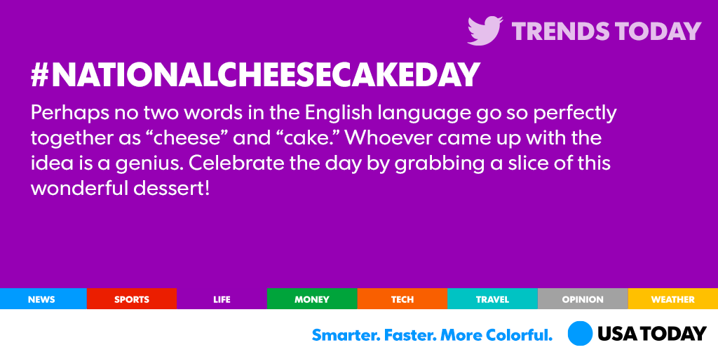 Agree! RT @USATODAY: With all these “days” to celebrate now, do we really need #NationalCheesecakeDay? Yeah, we do!pic.twitter.com/z4aJB9oeZr