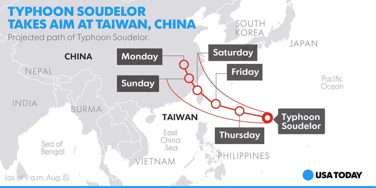 Here's the projected path of Super Typhoon Soudelor, which is headed for Taiwan and China: http://usat.ly/1JM4Zwt pic.twitter.com/gGSpq4559Y