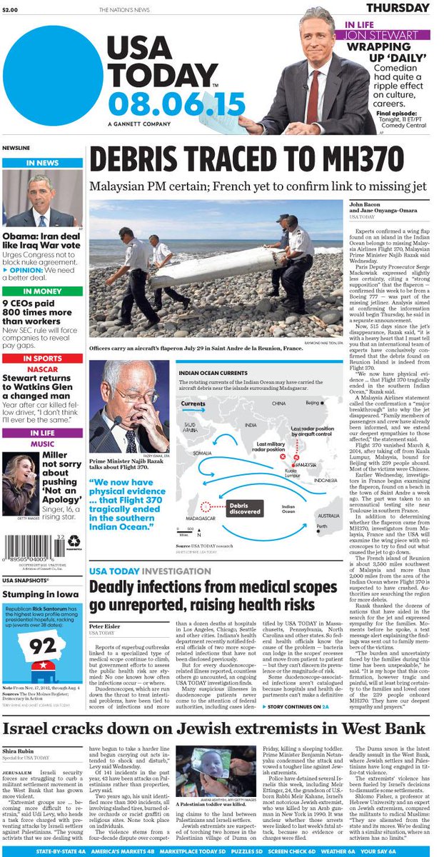 A look at Thursday's paper: Debris traced to #MH370. #JonStewart wraps @TheDailyShowpic.twitter.com/HybdLqGJKc
