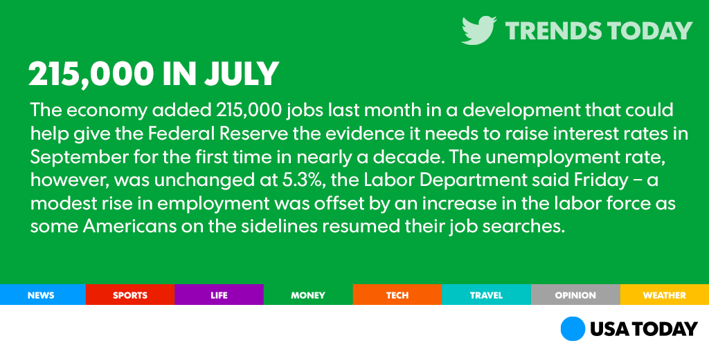 Things are looking up: Employers added a solid 215,000 jobs in July. http://usat.ly/1Pbampc pic.twitter.com/BUqcXHDyY1