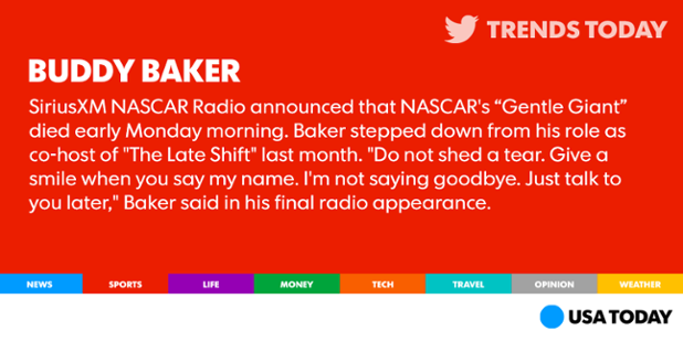 Buddy Baker, a former Daytona 500 winner, has died. He announced last month he had lung cancer http://usat.ly/1Wd8rVI pic.twitter.com/lpWWDRdcZr