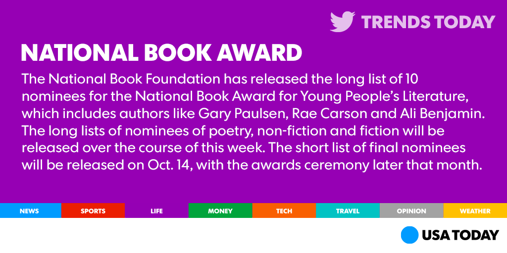 Love reading? Check out the nominees for the National Book Award for Young People’s Literature http://usat.ly/1KaamSo pic.twitter.com/VKoHVhwJ4f