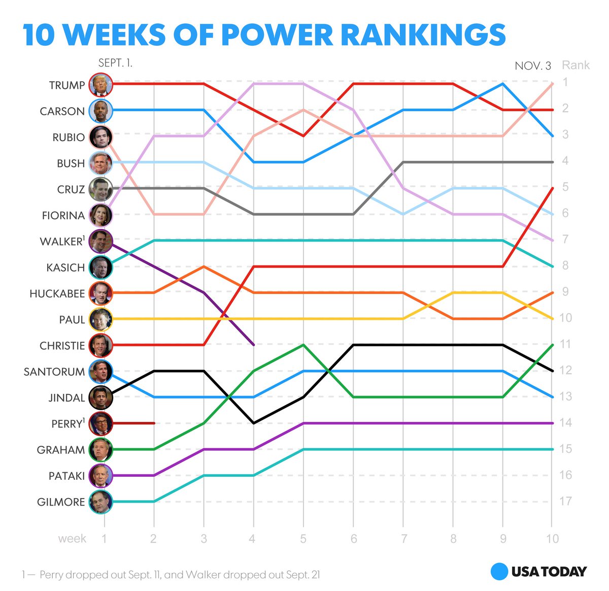 How the Republican race has changed, over 10 weeks of GOP Power Rankings: http://usat.ly/1LOaCJX pic.twitter.com/5I180YZHLa