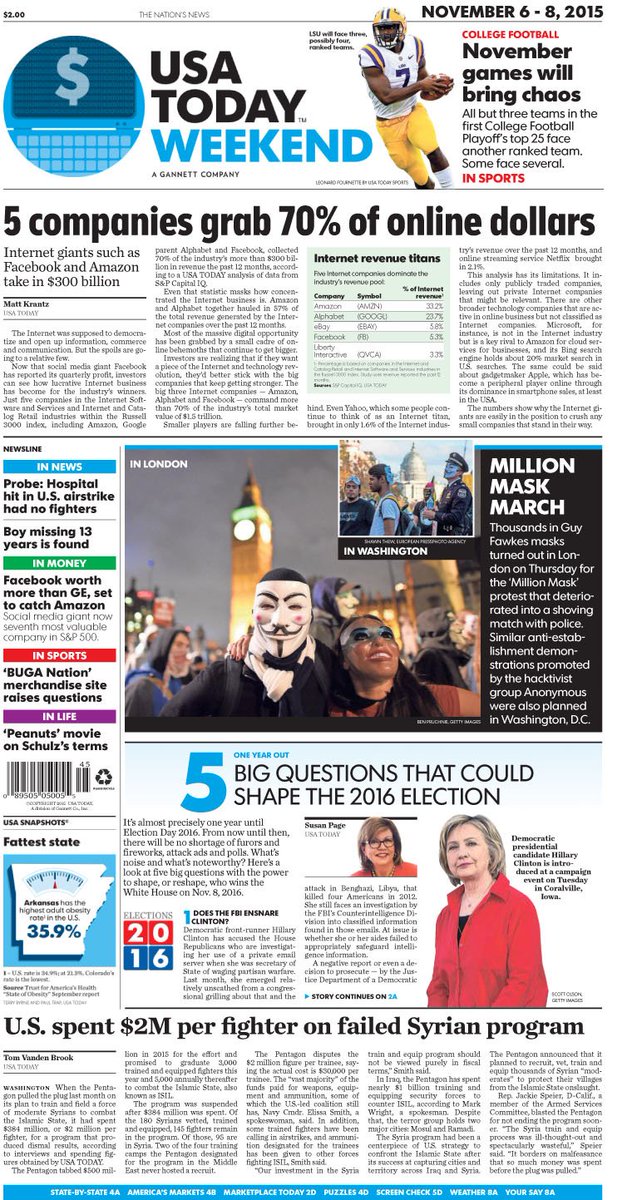 A look at Friday's paper: November brings chaos for #CollegeFootballPlayoffs; 70% of #onlinedollars go to 5 titanspic.twitter.com/8dxPCdqlDY