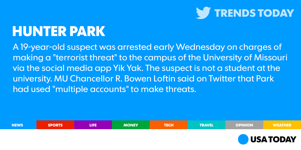 Hunter Park, the man accused of making a terrorist threat at #Mizzou, was arrested. http://usat.ly/1MXuqOw pic.twitter.com/NL8UrG6qcE