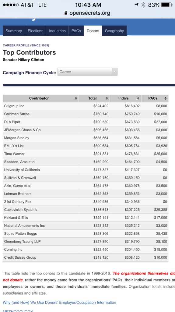 @USATODAY @BernieSanders @HillaryClinton By giving this money to Hillary (https://www.opensecrets.org/politicians/contrib.php?cid=N00000019&cycle=Career … …), Wall Street will get even more power.