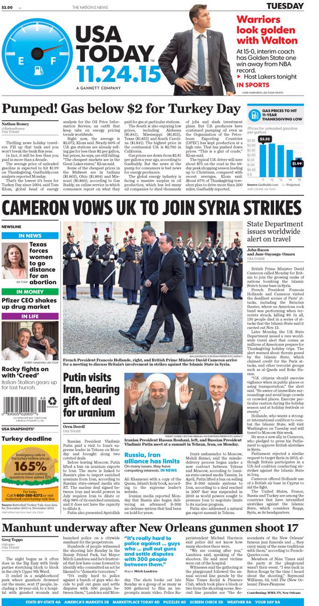 Today's #frontpage: Manhunt underway in #NewOrleans shooting. #Gas prices to hit 11-year low for #TurkeyDay.pic.twitter.com/EG1pV8ESlX