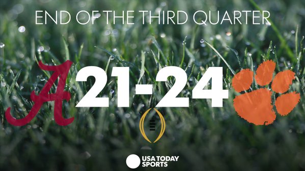 Three quarters down, one to go! #Clemson 24 #Alabama 21 #NationalChampionship http://usat.ly/1P5rOJh pic.twitter.com/f3aA4KVajA