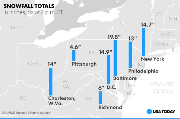 official snowfall totals as2 p.m.: Almost 15" in D.C. & NYC, 20" in Baltimore http://usat.ly/1S1MAkc via