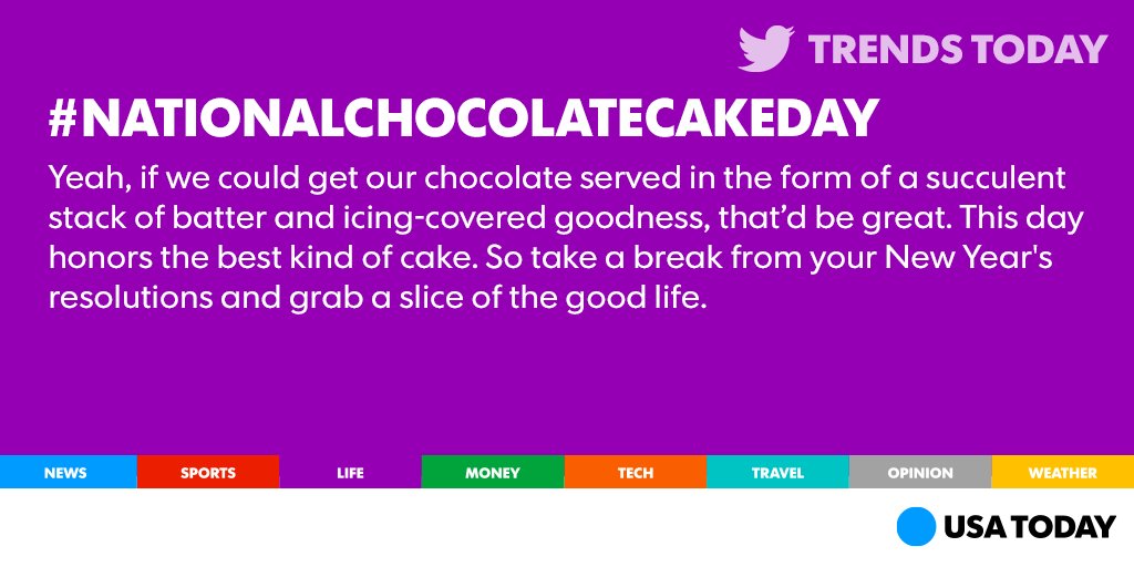 @USATODAY Thank you for reminding me... It's On #@NationalChocolateCakeDayThanks. Twitter will use this to make your timeline better. UndoUndo