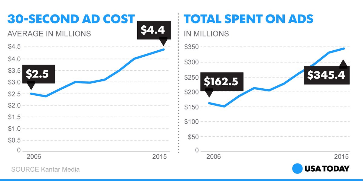 Big game, big brands, bigger bucks. The price of #SuperBowl airtime is up 76% over the past decade -- @Kantar_Mediapic.twitter.com/ibVDf3wUnD