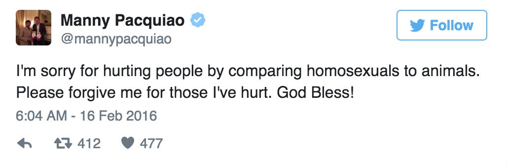 @USATODAY Homosexuality is common in all animals. Pacquiao needs to educate himself about life and the wild-animal "sport" of boxing.