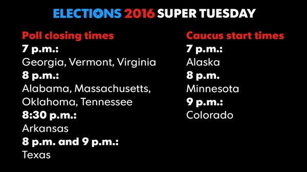 Polls just closed in Georgia, Vermont and Virginia. Here's a look at the rest of the #SuperTuesday schedule.pic.twitter.com/goVv755VZF