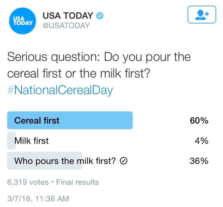 @USATODAY: Serious question: Do you pour the cereal first or the milk first?#NationalCerealDay"Thanks. Twitter will use this to make your timeline better. UndoUndo