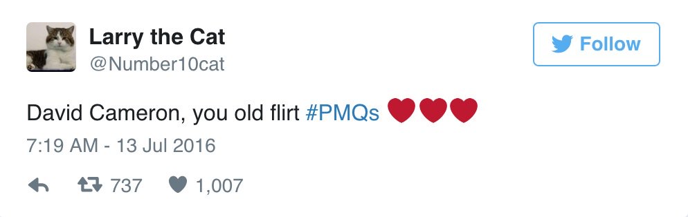 Larry the cat tweets about Cameron's exit: http://usat.ly/29PrfMq  (Screenshot) #PMQspic.twitter.com/6iyLB78edP