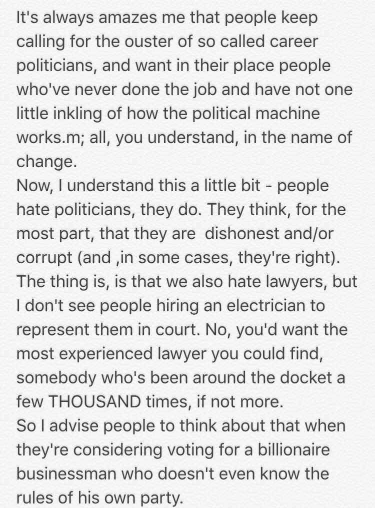 Yeah, b/c the last person you'd want in a political office, running a political & diplomatic machine, is a politician.