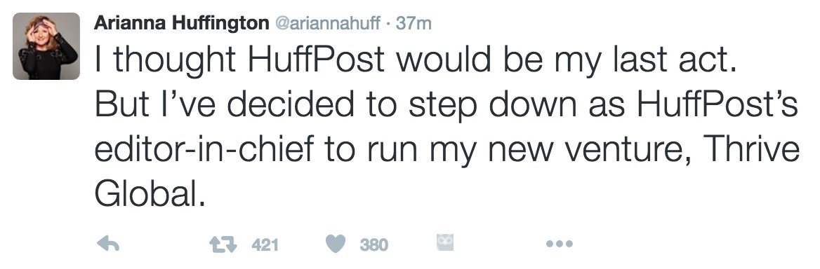 @ariannahuff says she's stepping down as @HuffingtonPost's editor-in-chief to run a new venture.pic.twitter.com/DdV1sCLXKk