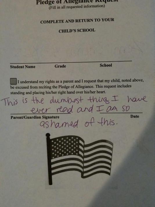 This is America. We don't force people to say things. The pledge loses all its power if we force people to say it