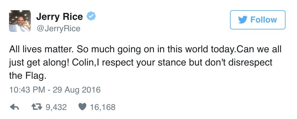 I applaud @JerryRice for taking a stand vs lunacy. There are better ways for Kaep to make a difference vs disrespecting the flag!!