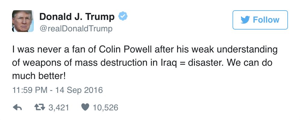 The facts are that General Powell executed Desert Storm became Secretary of State. Public service record.Comrade Trump is a moron.