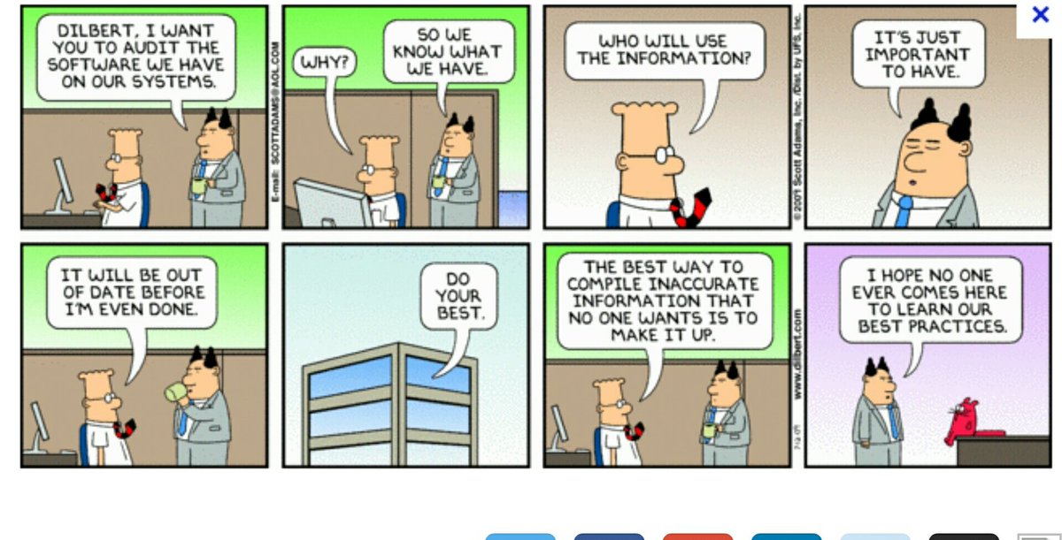 Dilbert sums it up nicely. Kit won't fix internal issues that should have been found w #Testing @myitforum http://myitforum.com/myitforumwp/2016/10/06/how-to-perform-a-software-update-audit/ …pic.twitter.com/jxWwlopeCE