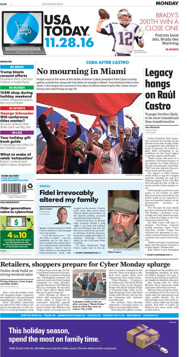 On today's #frontpage: #FidelCastro's legacy in #Cuba hangs on brother #RaulCastro; Retailers, shoppers set for #CyberMonday splurgepic.twitter.com/wQDpzPDCZk