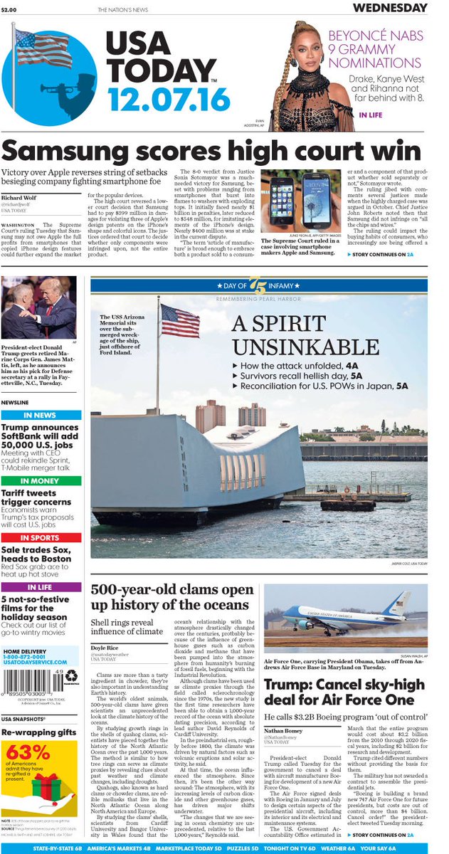 On today's #frontpage: @samsung scores high court win over @Apple; @realDonaldTrump blasts $3.2B #AirForceOne program as 'out of control'pic.twitter.com/8bi11Vfrgu