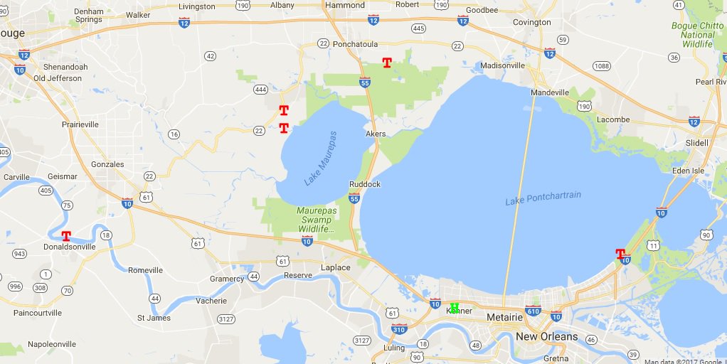 Locations of today's tornado reports, from @NWSSPC (red "Ts" #NewOrleans #tornadoes pic.twitter.com/0EgCWuJ2VC