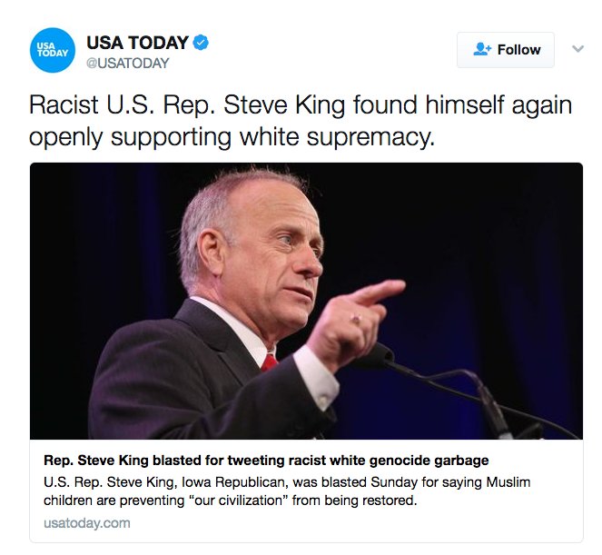 Changing your Tweet: U.S. Rep. Steve King found himself again openly professing white nationalist views". Sincerely, The Truth!