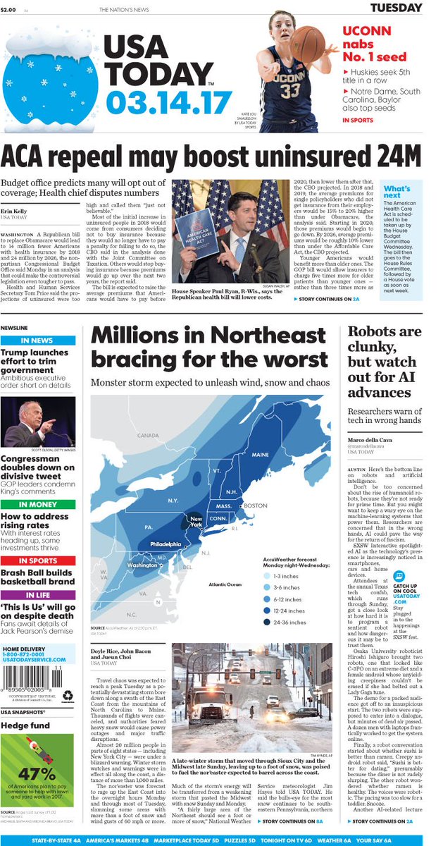 A look at Tuesday's paper: #Northeast braces for #blizzard2017 #Stella; @UConnWBB top seed in @NCAA women's tournamentpic.twitter.com/M6bypK0ZQT