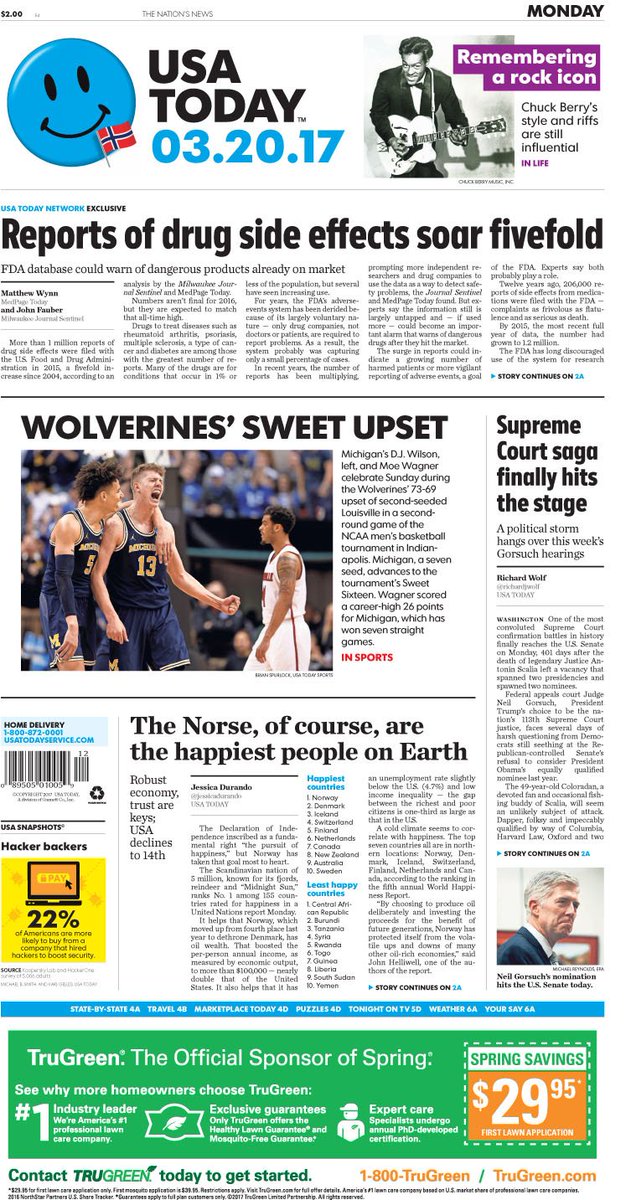 A look at Monday's paper: Rock icon #ChuckBerry's style and riffs still influential; #Norway tops @UN list of happiest nations on Earthpic.twitter.com/2ZJ7EyvrIO