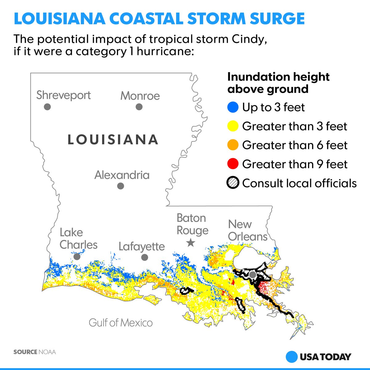The potential impact of Tropical storm Cindy in Louisiana if it were a hurricane. https://usat.ly/2sPnpdF pic.twitter.com/fCmmpNflIo