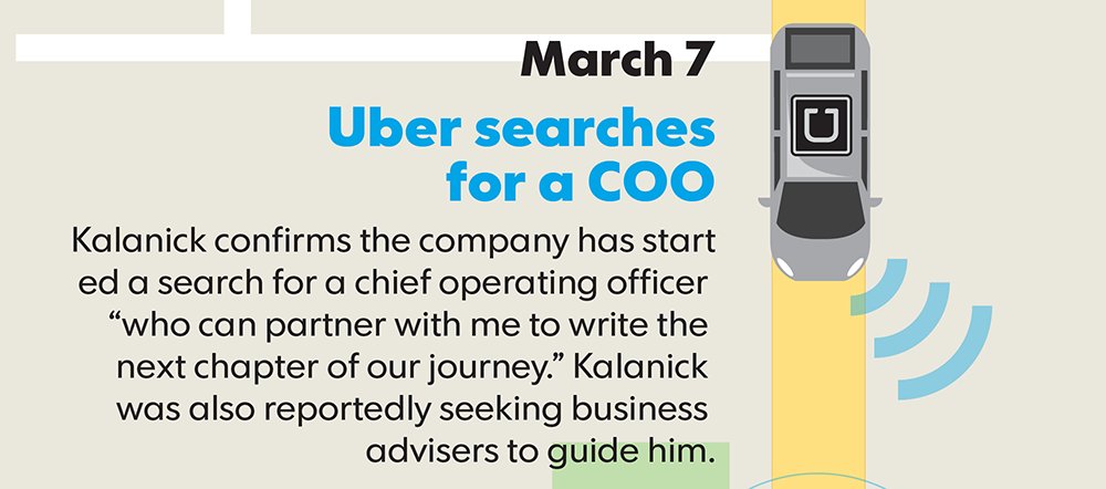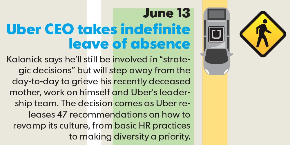 6/13: Another double pothole as Kalanick takes an indefinite leave of absence, and a major investor resigns after making a sexist remark.pic.twitter.com/R9EtI0d7Lt