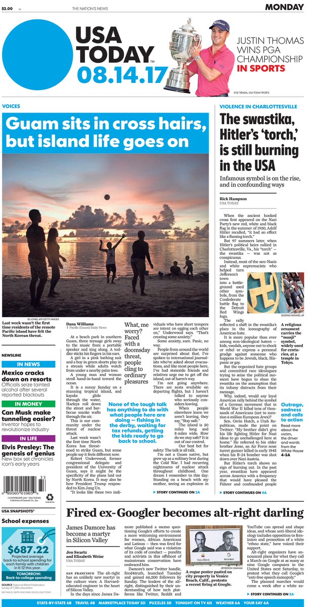 On today’s #frontpage: Life goes on in #Guam; In #Charlottesville, Swastika symbolizes hate; Fired #Google engineer becomes alt-right martyrpic.twitter.com/UqChXImK3T