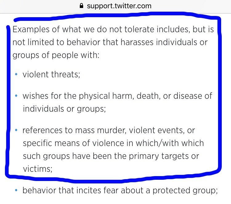 Maybe Twitter should enforce their own terms of service and shut down the account of the Tweeter-in-Chief. (thanks