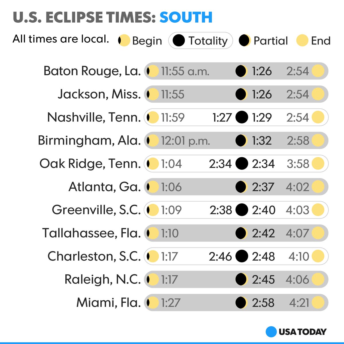 It's Eclipse Day! Wondering when to look for #Eclipse2017? Here's a breakdown by time zone, starting with the East. https://usat.ly/2ijoAhT pic.twitter.com/slT28kIoaM