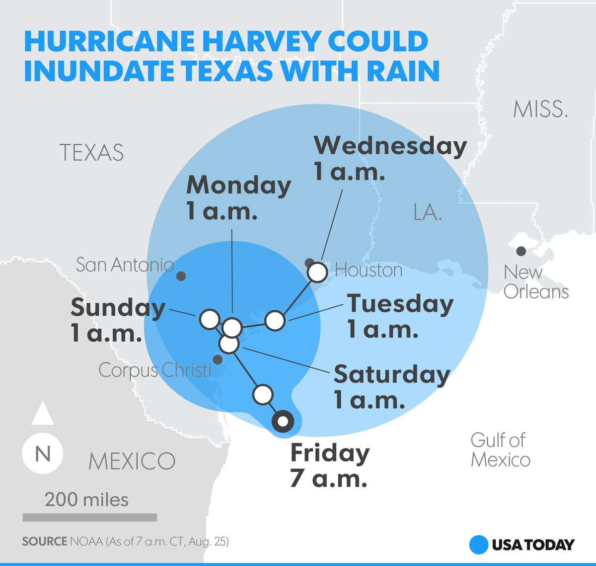 A closer look at Hurricane Harvey's expected path: The storm could inundate Texas with rain until Wednesday. https://usat.ly/2xwJblj pic.twitter.com/MVZXjUjdjR