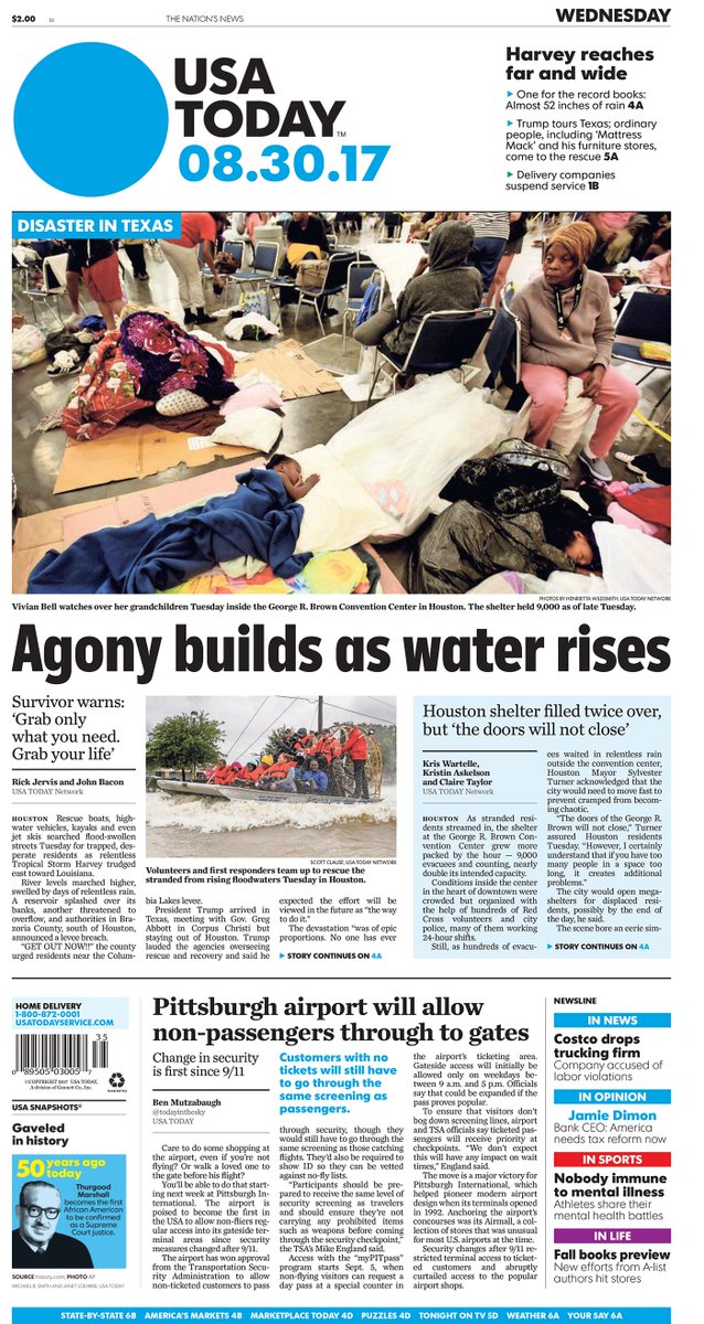 On today’s #frontpage: Agony in #Houston as water rises; shelter filled twice over; #Pittsburgh airport will allow non-passengers to gatespic.twitter.com/At2ajHC0KF