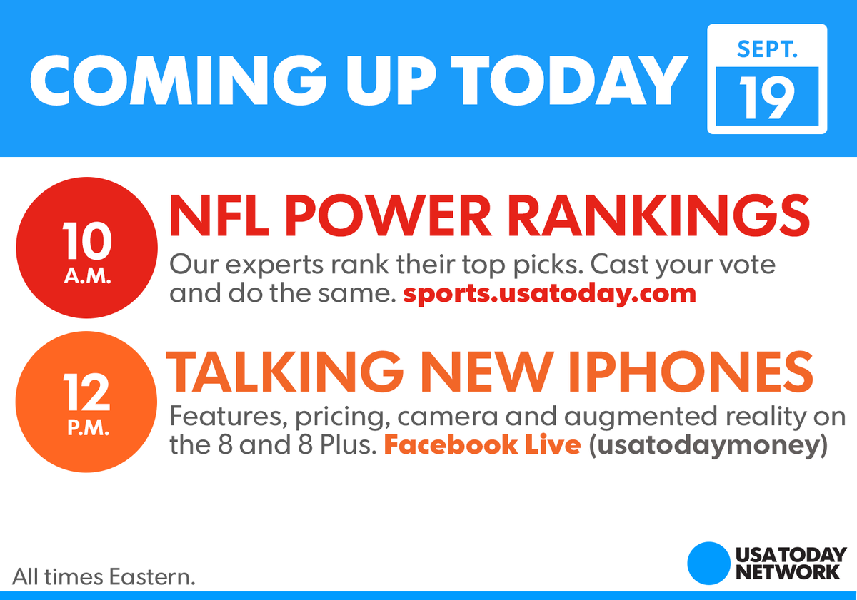 Coming up today from the USA TODAY Network: Cast a vote on our NFL Power Rankings, and the new iPhones dissected: https://usat.ly/2fu1xNm pic.twitter.com/mL7EnuTiYX