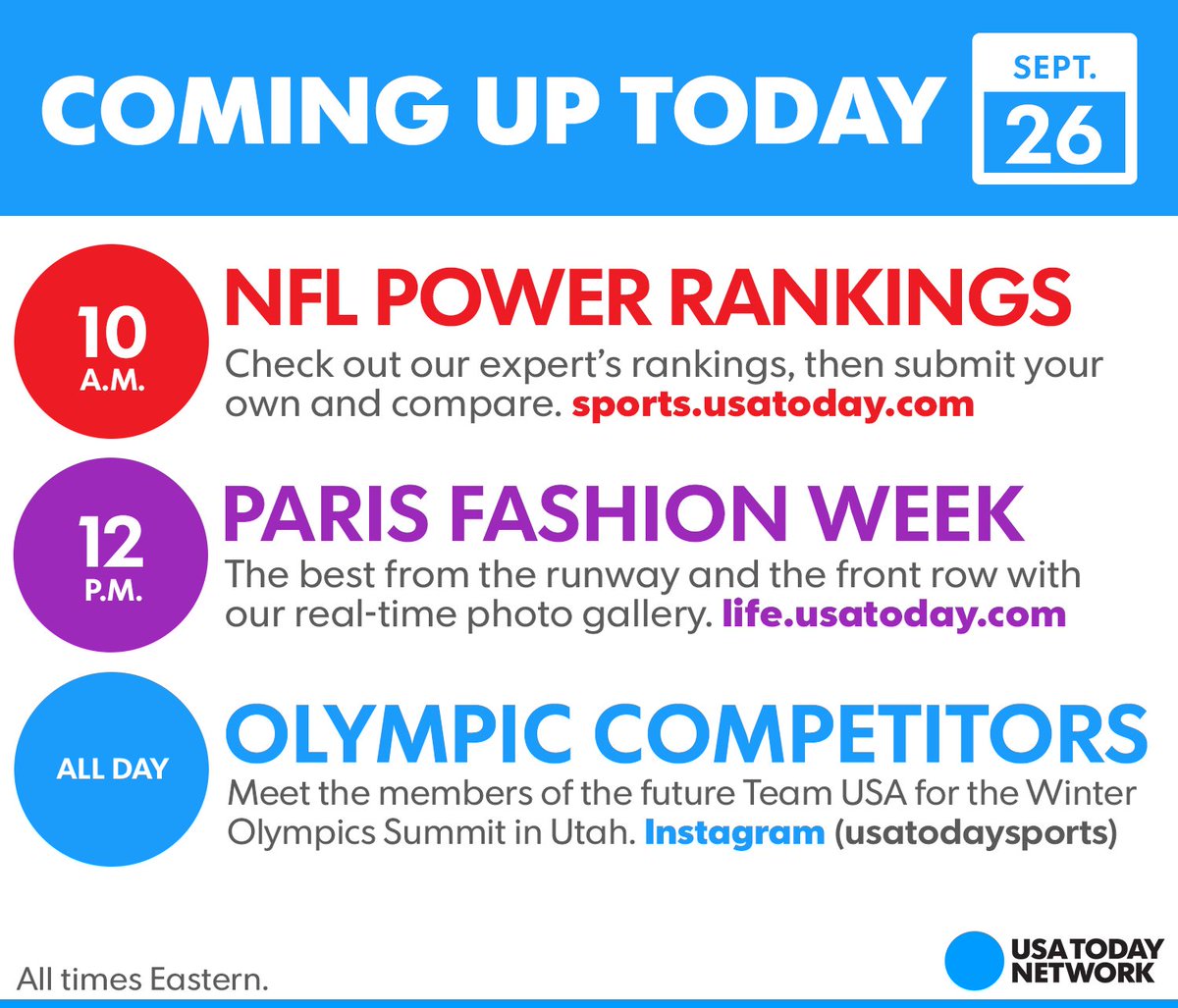 Coming up today from the USA TODAY Network: Meet future Olympians, Paris Fashion Week, NFL Power Rankings: https://usat.ly/2ftyxZe pic.twitter.com/yl5ivBViIU